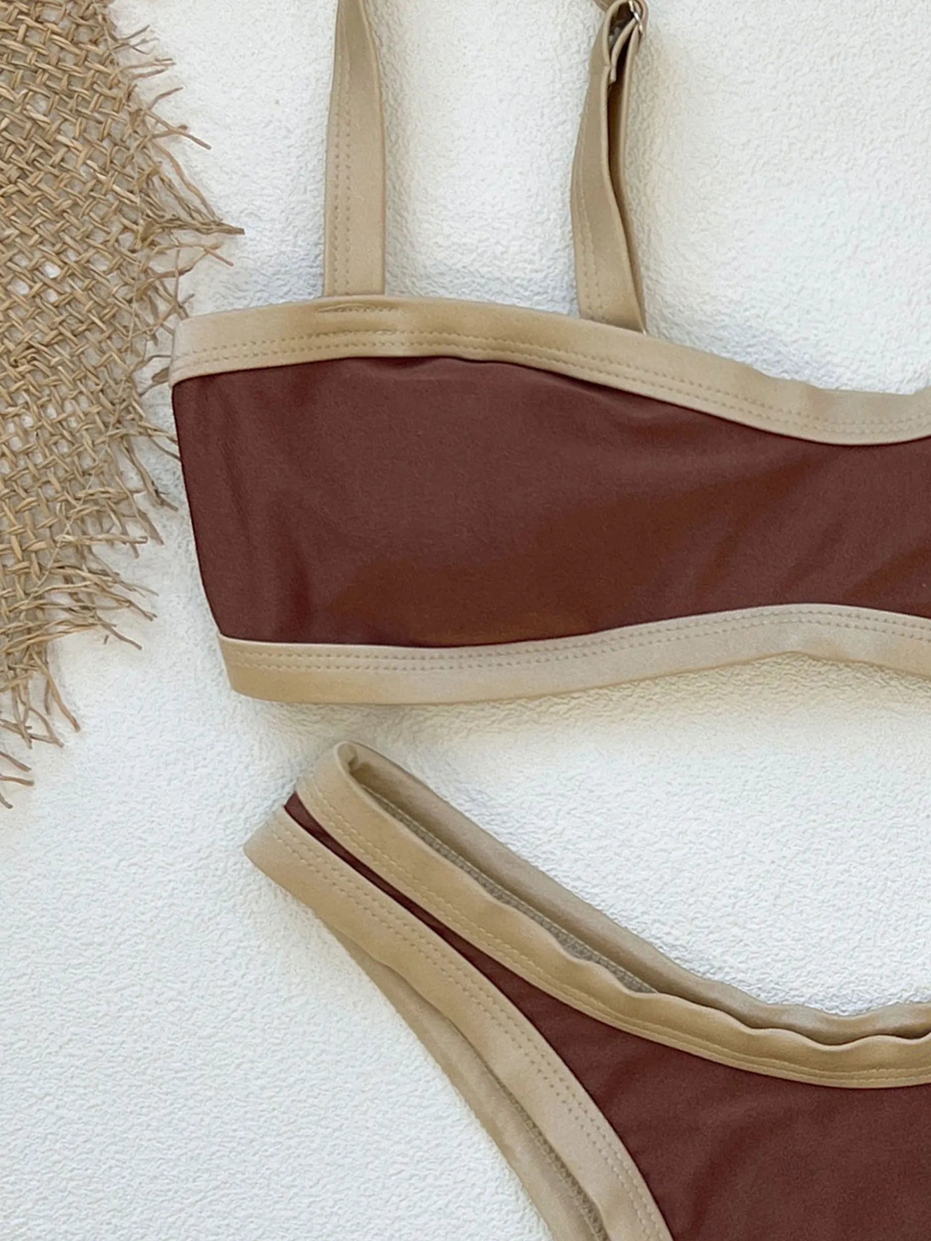 Bikini de dos piezas confeccionado en tejido elástico con acabado suave. Top de escote recto con tirantes finos y detalle de ribete en contraste metalizado. Diseño estructurado que aporta sujeción ligera. Braguita de tiro medio con doble ribete metalizado a juego que enmarca la silueta. Un modelo en combinación bicolor, ideal para un look de playa sofisticado y actual