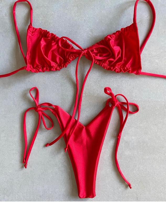 Top a triangolo con dettaglio arricciato e laccio centrale regolabile. Spalline sottili regolabili.